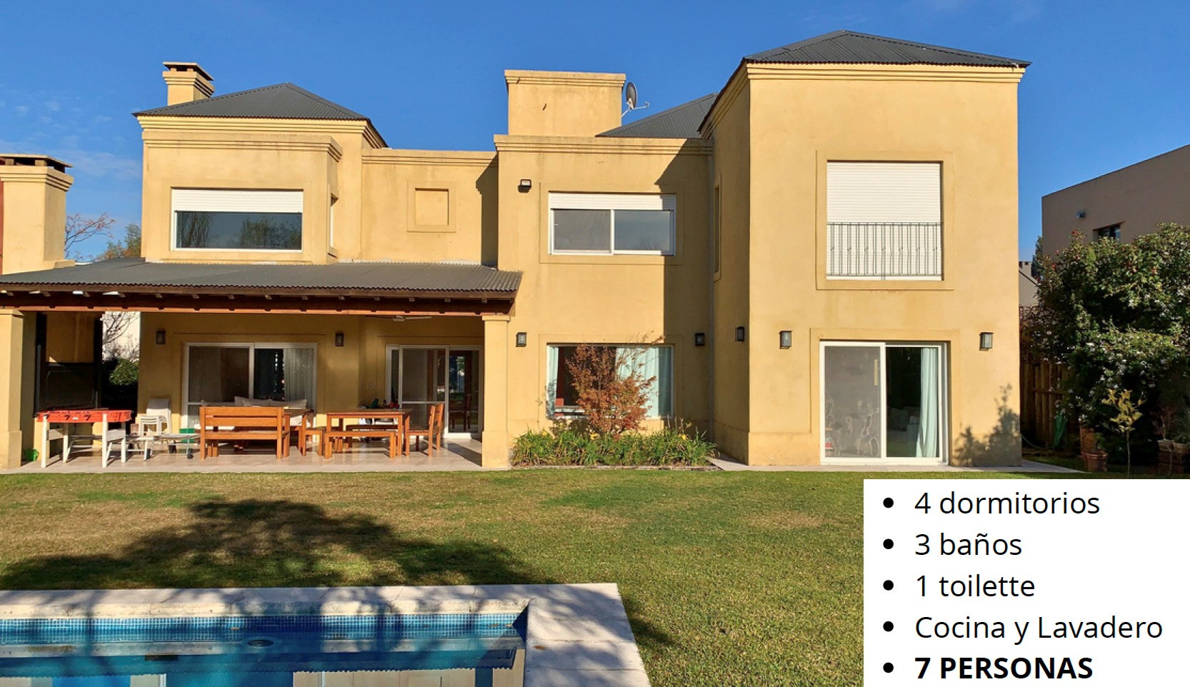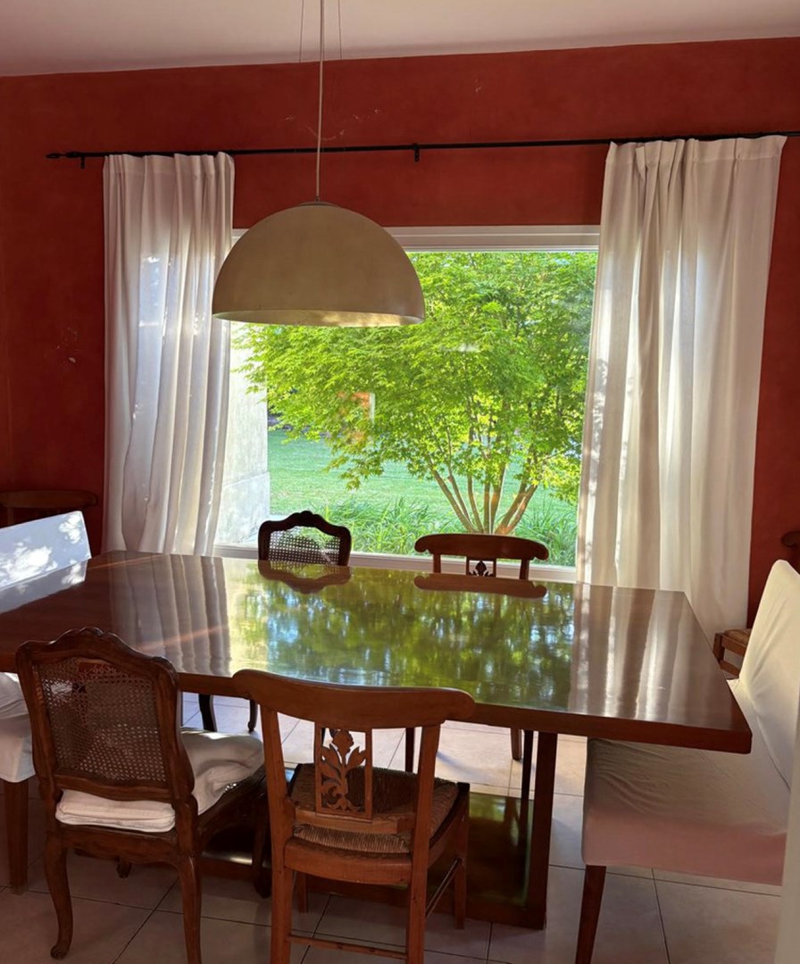 ALQUILER VERANO 30 de Diciembre al 31 enero Usd 5.500 + gastos No acepta perros durante el alquiler ! PB : Living comedor , toilette, cocina con Aire Acondicionado t Playroom con Aire Acondicionado PA: 4 dormitorios y 3 abaños, Dormitorio principal en suite con vestidor y Aire Acondicionado Suite Junior con Aire Acondicionado 2 Dormitorios mas que comparten un baño con Aire Acondicionado Playroom en PA Exterior: Pileta ( sin reja) , galeria grande y cochera para 3 autos Gastos aproximados al inicio de Octubre: Expensas $600.000 / Jardinero $150.000 / Direct TV $120.000 “La información de la unidad así como las medidas son aproximadas y orientativas. Las medidas exactas deberán ratificarse con la documentación pertinente y no comprometen a la empresa. las mismas surgirán del título de propiedad" Fotografías no vinculantes ni contractuales. “en el caso de Venta,la misma esta supeditada al cumplimiento por parte del propietario de los requisitos de la Resolución General 2371 de la AFIP.” Fama Bienes Raices CMCPSI 6387 CUCICBA 7653
