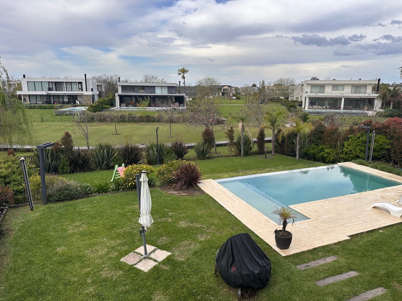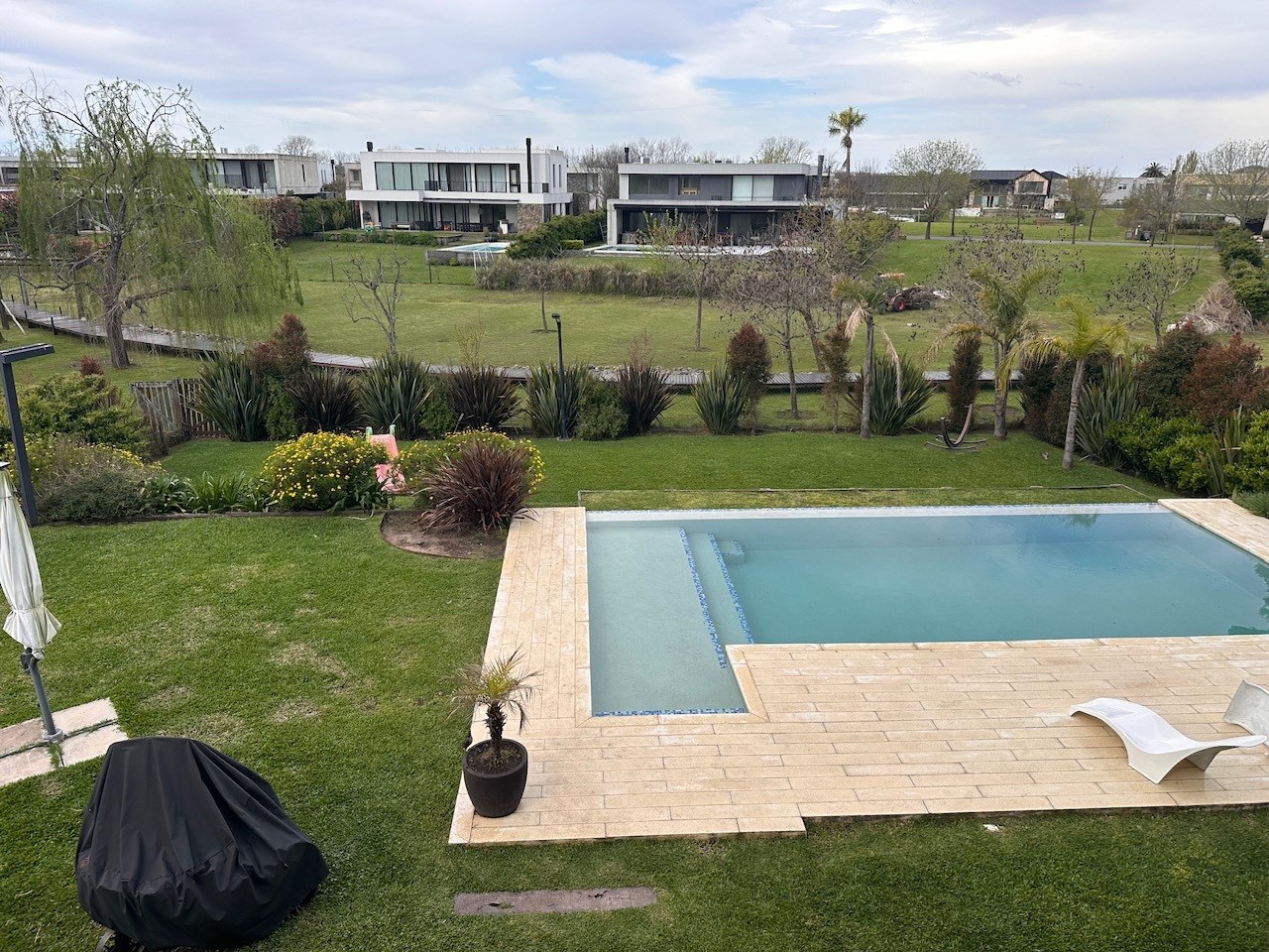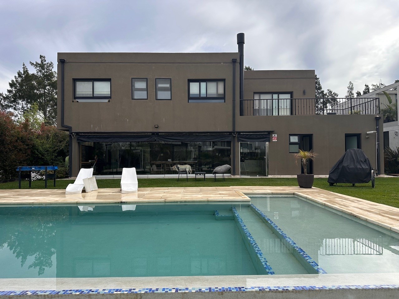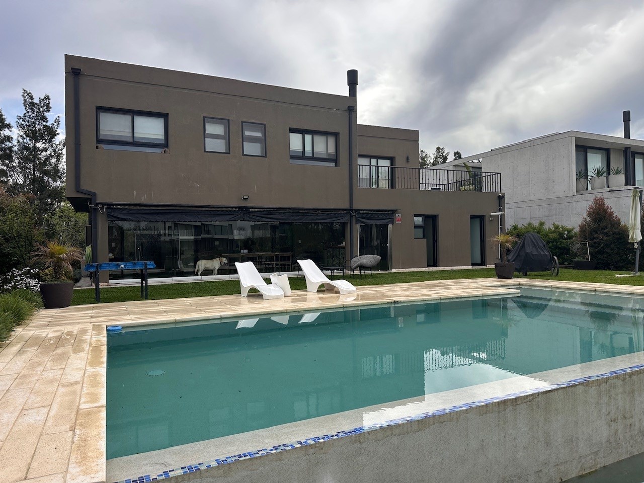 Casa en Alquiler y Venta Albanueva 3 dormitorios y pileta con amplios ambientes sociales. Acepto departamento en parte de pago! Racionalista, funcional, de líneas rectas y al mismo tiempo cálida, vista a la reserva, con amplios espacios que invitan a compartir momentos del día. Al ingreso amplio hall, escalera de madera maciza con barandas de blindex que le da categoría. Doble circulación a cocina y living comedor. Amplio toilette. El living comedor cómodo que al ser bien largo queda bien separado, pasa lo mismo con la cocina la cual es amplia con isla y comedor diario. Equipada con alacenas, bajo mesadas, horno 6 hornallas, extractor, lavavajillas, heladera doble, amplia bacha de acero inoxidable, doble despensa. Amplio lavadero y amplio cuarto exterior de guardado. Baño exterior. Galería con cerramiento de pliegues, uno de los ambientes más utilizados, ventiladores de techo, aire acondicionado, parrilla con barra, bacha y cocina. Muy linda vista al jardin, reserva y a la pileta con borde infinito. Tranquila y privada. El acceso vehicular es doble, con espacio para 2 vehículos cubiertos y 4 descubiertos. En planta alta nos encontramos con un espectacular playroom de grandes dimensiones, hoy lo utilizan como lugar de estar, gym y zona de entretenimiento. Este amplio espacio vincula a los 3 dormitorios y al escritorio. Los dormitorios secundarios tienen vista al jardín y son en semi suite. La Master suite tiene salida a terraza, vestidor y amplio baño con bañadera y box de ducha. La calefacción es por losa radiante a Gas, aires acondicionados en todos los ambientes, cortinas roller y sunscreen de acuerdo a las necesidades, pisos de mármol travertinos Grandes, puertas de madera maciza, aberturas de aluminio DVH. La casa está impecable, lista para mudarse.