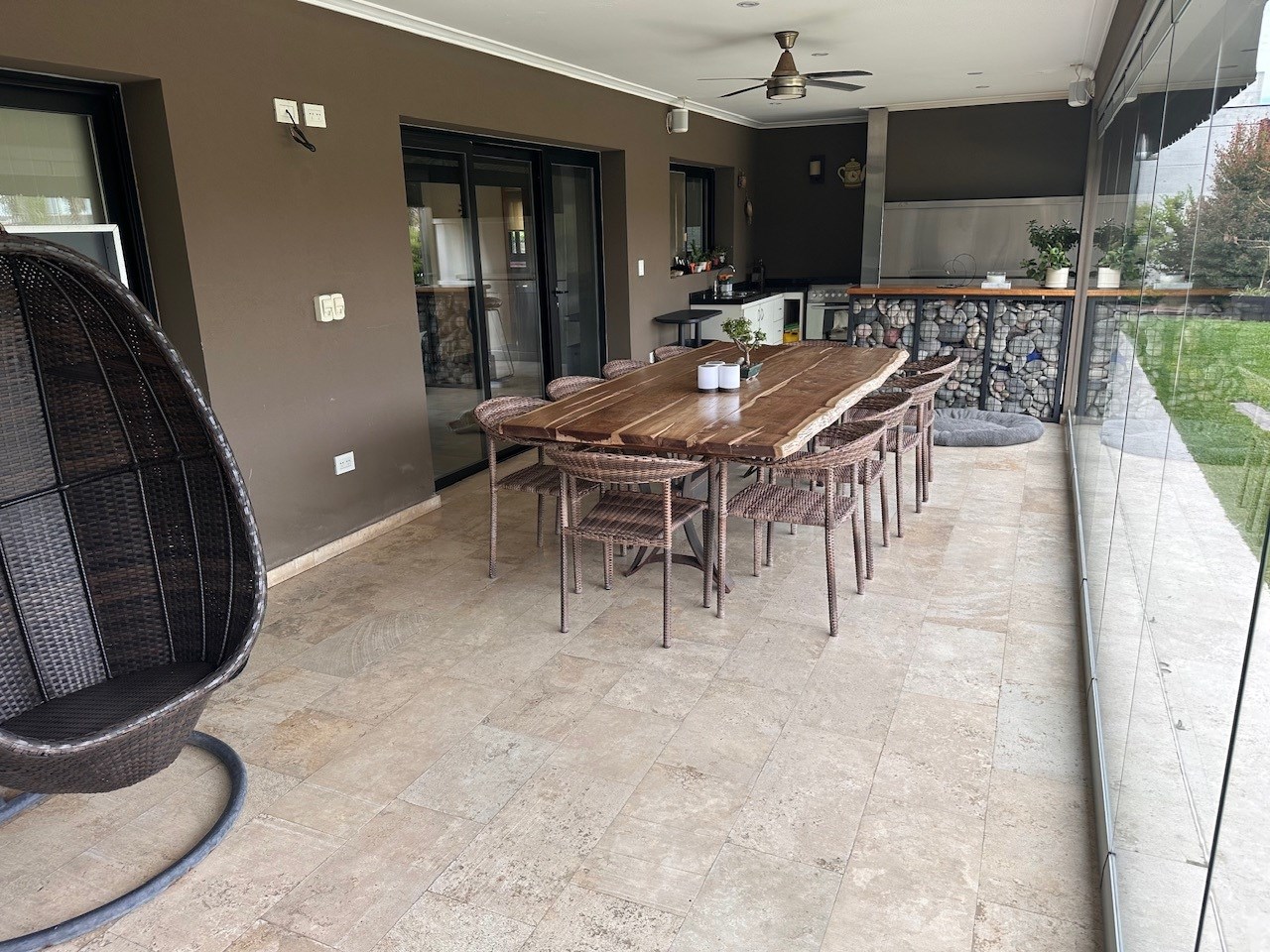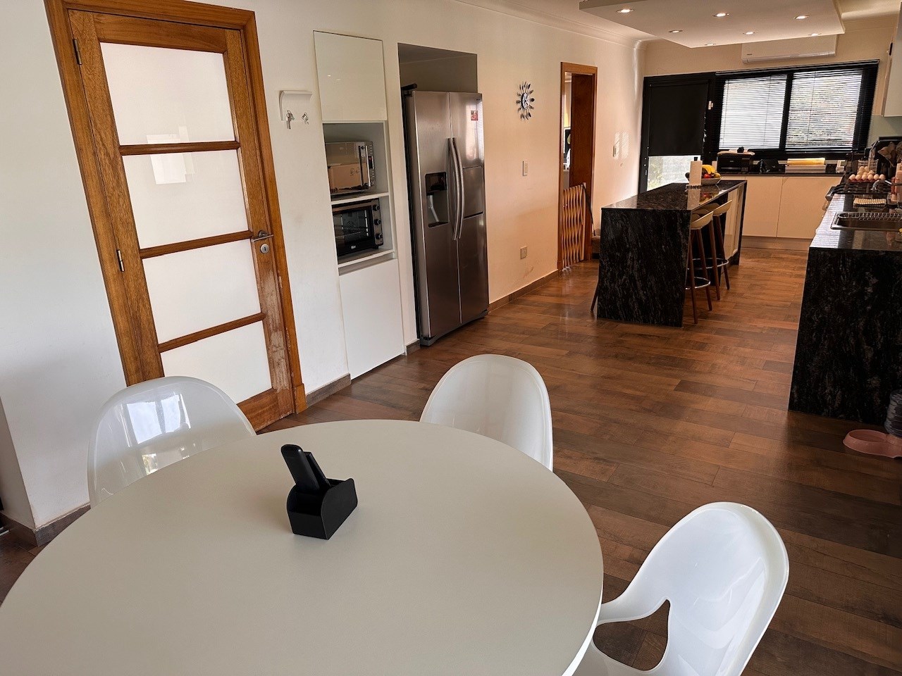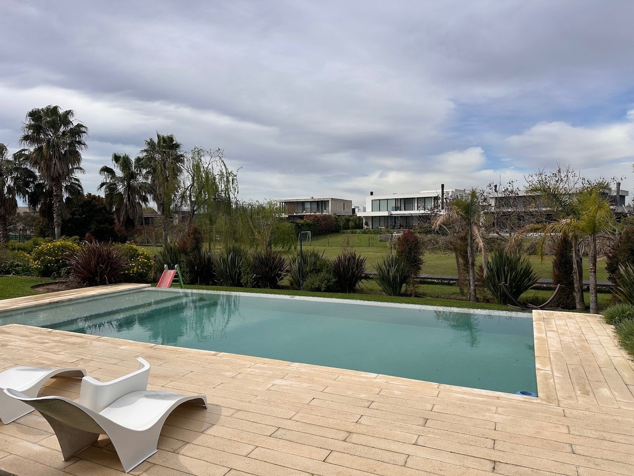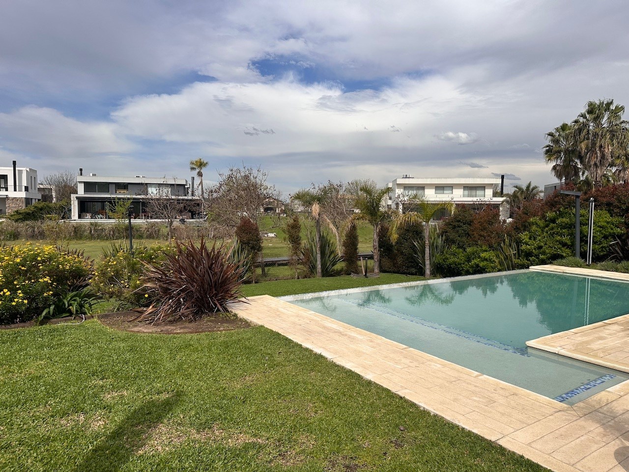 Casa en Alquiler y Venta Albanueva 3 dormitorios y pileta con amplios ambientes sociales. Acepto departamento en parte de pago! Racionalista, funcional, de líneas rectas y al mismo tiempo cálida, vista a la reserva, con amplios espacios que invitan a compartir momentos del día. Al ingreso amplio hall, escalera de madera maciza con barandas de blindex que le da categoría. Doble circulación a cocina y living comedor. Amplio toilette. El living comedor cómodo que al ser bien largo queda bien separado, pasa lo mismo con la cocina la cual es amplia con isla y comedor diario. Equipada con alacenas, bajo mesadas, horno 6 hornallas, extractor, lavavajillas, heladera doble, amplia bacha de acero inoxidable, doble despensa. Amplio lavadero y amplio cuarto exterior de guardado. Baño exterior. Galería con cerramiento de pliegues, uno de los ambientes más utilizados, ventiladores de techo, aire acondicionado, parrilla con barra, bacha y cocina. Muy linda vista al jardin, reserva y a la pileta con borde infinito. Tranquila y privada. El acceso vehicular es doble, con espacio para 2 vehículos cubiertos y 4 descubiertos. En planta alta nos encontramos con un espectacular playroom de grandes dimensiones, hoy lo utilizan como lugar de estar, gym y zona de entretenimiento. Este amplio espacio vincula a los 3 dormitorios y al escritorio. Los dormitorios secundarios tienen vista al jardín y son en semi suite. La Master suite tiene salida a terraza, vestidor y amplio baño con bañadera y box de ducha. La calefacción es por losa radiante a Gas, aires acondicionados en todos los ambientes, cortinas roller y sunscreen de acuerdo a las necesidades, pisos de mármol travertinos Grandes, puertas de madera maciza, aberturas de aluminio DVH. La casa está impecable, lista para mudarse.